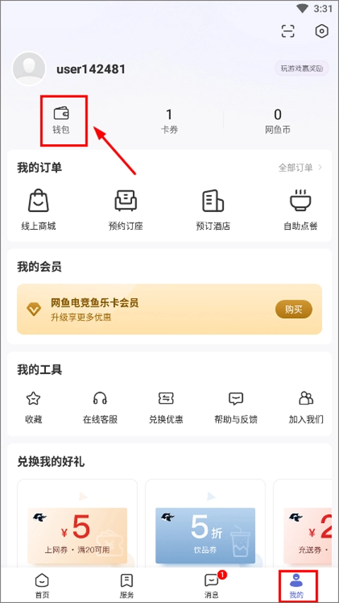 1、第一步打开网鱼网咖应用,找到右下角的“我的”选项并点击,接着登录自己的账号,之后点击钱包功能入口。