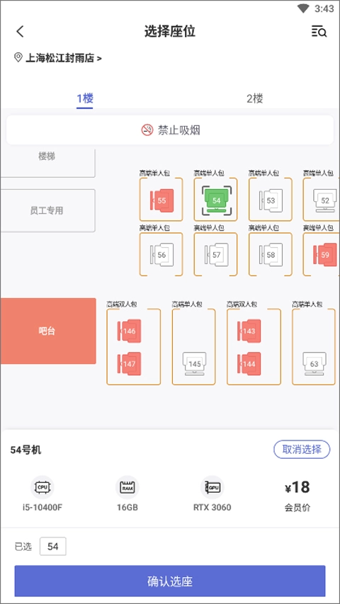 4、最后是选择网咖座位这一步,用户还能查看座位对应的电脑配置,以便更合理地做出选择。