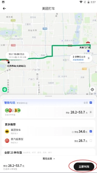4、等待美团打车系统计算好价格之后就可以点击“立即叫车”了