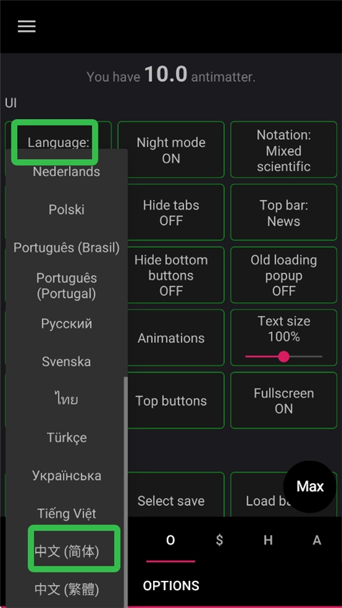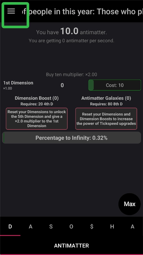 5、有很强的离线进度(所有维度都会继续产生较低的维度,你会获得反物质),然而离线时不会发生购买,所以离线时间通常只是让你到下一个提升/星系,而不是更进一步。