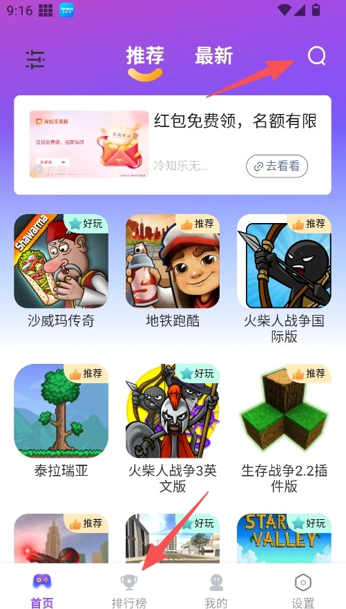 1、在首页浏览“推荐”“最新”分类选择游戏。
