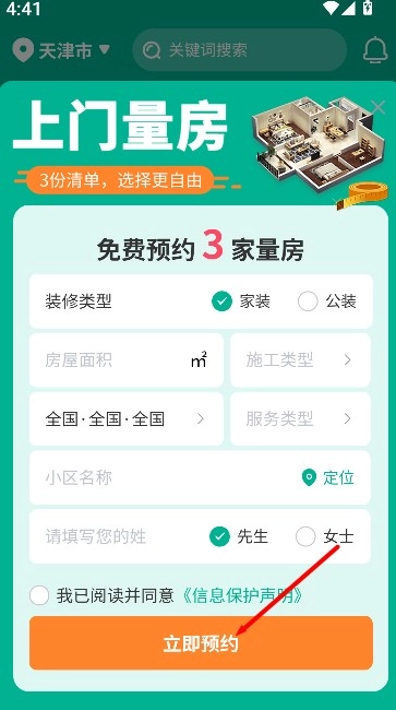 3、若对某个方案感兴趣,可点击预约入口填写信息,发起量房预约,获取后续设计服务。