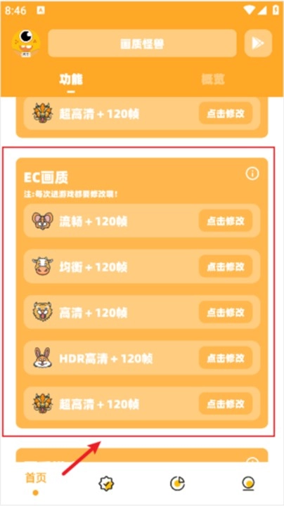 3、在“EC画质”列表里挑选“超清+120帧”的配置选项,点击“修改”按钮后,软件会自动应用该画质方案,不需要用户手动去调整各项参数。