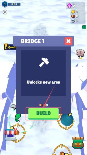 4、建造桥梁:在指定位置点击“BUILD”按钮,使用收集到的资源建造桥梁,解锁新区域继续游戏。