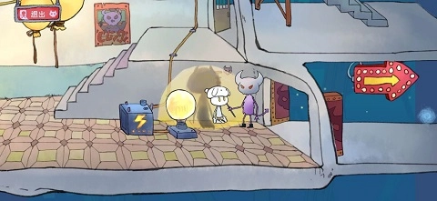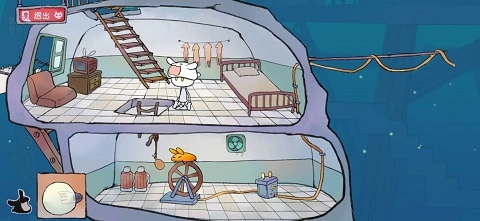 2、进入后会看到一个正在煮饭的人,起初可以进去捡鸡腿,接着往右下走拿气球,此时会发现绳子和气球组合好了,再回到煮饭的房间,向左走,把气球拖到水管处,气球就会飞起来,那个胖子会站起来,留下灯泡。拿到灯泡后,顺着他坐的位置下去,把绳子拖到破楼梯上,绑上鸡腿,兔子就会开始发电。然后去拿气球的地方,放下灯泡,去量身高。