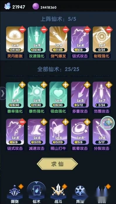 游戏中的技能,除了能抽卡获得外,还可以在洞天战斗中模拟获得和升级,提前领略未获得仙术的魅力。仙术只能上阵5个,需要玩家研究如何搭配才能快速通关。同时,每学会或者升级一种仙术,无需上阵,都可以提升玩家属性。