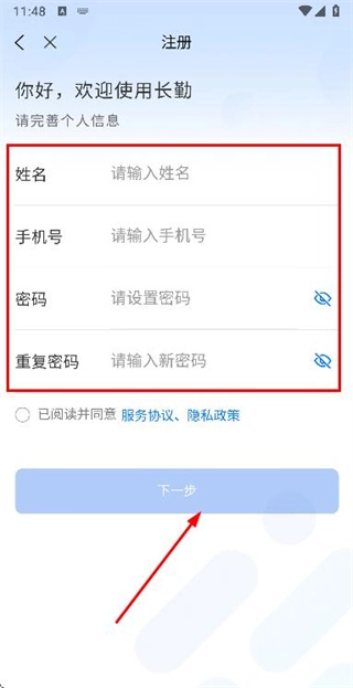 在注册账号页面填写好手机号码等相关信息后,点击“下一步”按钮。