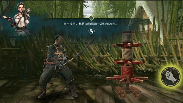 3、进入后有一个新手教程,点击按钮,即可快速攻击;