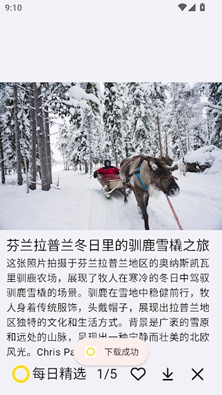 每日精选作为摄影作品展示平台,每日都会更新海量精品图片,涵盖人文地理、自然风光等多种类型,每张图片都配有简洁的文字介绍。用户在欣赏美图的过程中,还能了解到更多背后的故事。平台提供高清无水印的原图下载服务,这些图片可用于设置壁纸、社交平台分享等场景。此外,平台具备收藏功能,用户遇到喜欢的作品时,只需一键操作就能将其添加至收藏夹,方便日后随时快速查找。