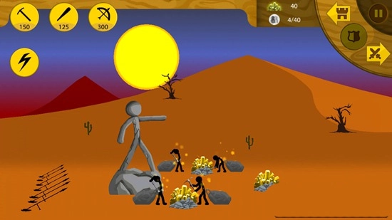 1、《遗产》作为一款经典的对战塔防游戏,首要任务是获取资源。我们只需点击屏幕左上角的“锄头”按钮,就能召唤出负责挖矿的火柴人——这些小家伙会拖着大包去开采矿石,而我们则能通过收集到的矿石,召唤更多用于战斗的火柴人。