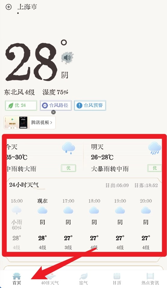 1、点击首页标签,即可查看当前的天气温度、风力风向、湿度,以及未来24小时的天气变化情况。