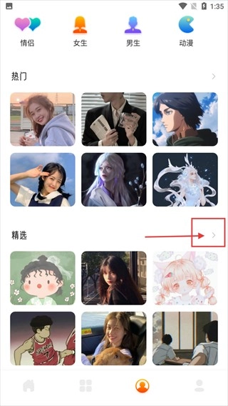 2、在个人页面,点击【精选】右侧的箭头,进入精选壁纸列表页。