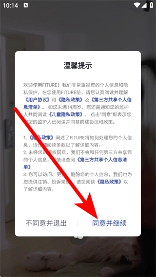 1、打开Fiture应用,当出现温馨提示弹窗时,点击“同意并继续”按钮。