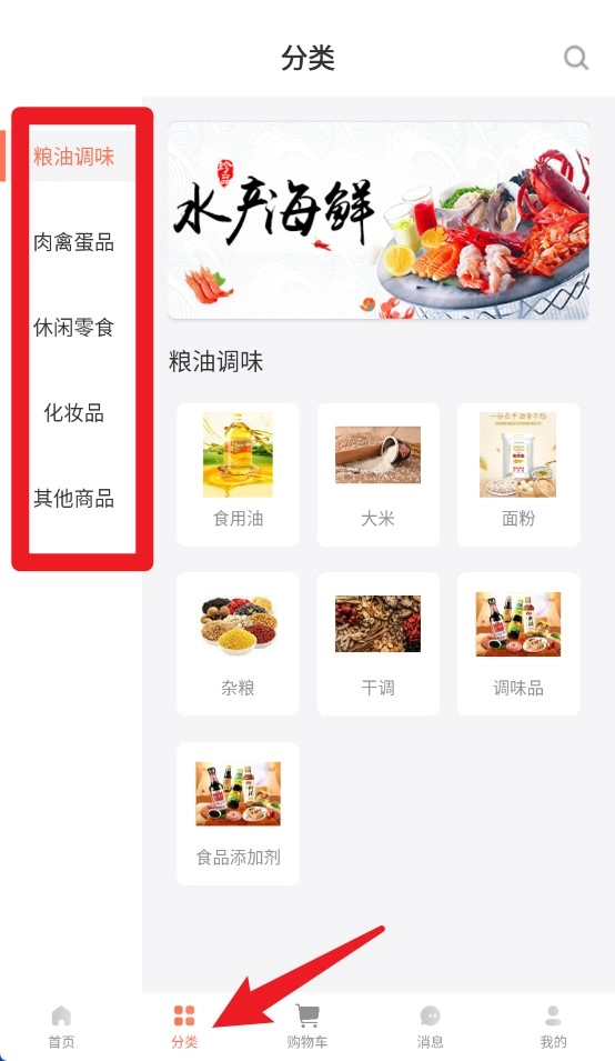 3、点击下方分类选项进入商品分类页面,左侧栏可切换品类,右侧浏览具体商品。
