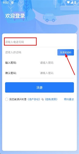 3、在注册账号页面填写验证码和密码,勾选协议后点击注册完成账号注册操作。