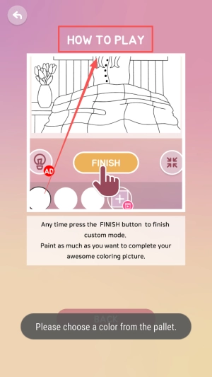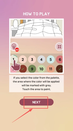 3、学习操作:在新手教学界面,查看How to Play说明,点击NEXT了解选色与涂色方法。