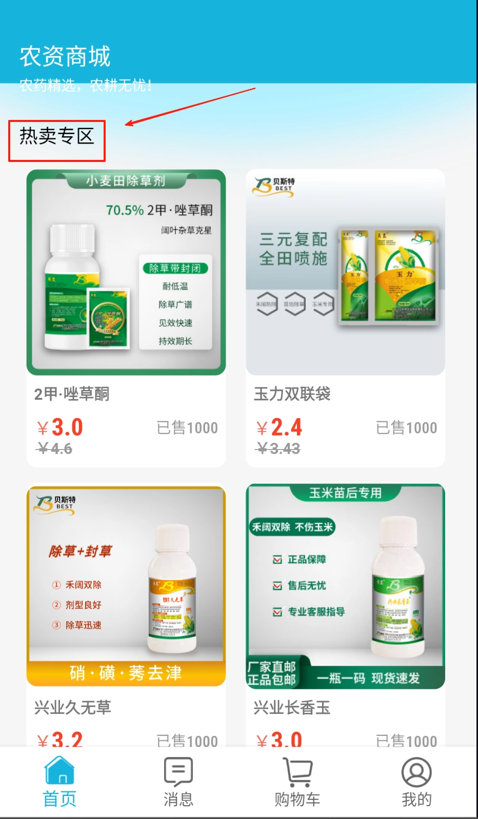 1、点击热门专区浏览农药化肥专区,筛选本地适用农资型号。
