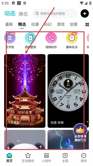 1、在壁纸应用的精选页面里,你可以找到【创意钟表】类的动态壁纸,这类壁纸呈现出带有天气信息和步数显示的表盘设计,只需点击就能进入它的详情页面啦。