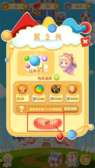 1、找到【第3关】的界面后,点击被红色框标注的【开始闯关】按钮,即可进入【第003关】的泡泡消除关卡,正式开启本次消除类游戏的挑战环节。