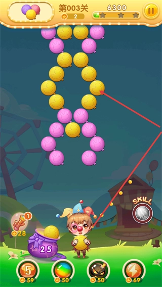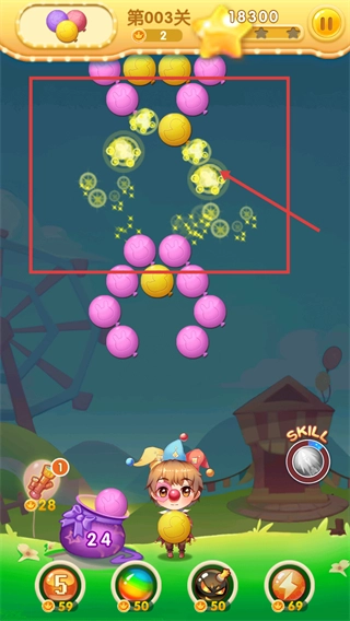 2、进入【第003关】后,瞄准红色轨迹对应的黄、粉泡泡区域发射,推进泡泡消除进度,积累关卡分数。