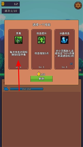 3、选择对应技能强化战斗能力,这是提升攻防效率的核心操作,可增强角色的输出或生存能力,应对后续波次的怪物。