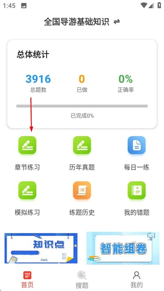 1、在导游资格证百分题库首页,点击章节练习选项,进入章节练习页面。