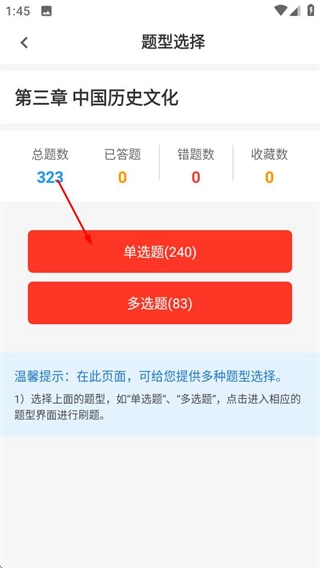 3、在题型选择页面,点击单选题选项,进入该章节的单选题作答页面。