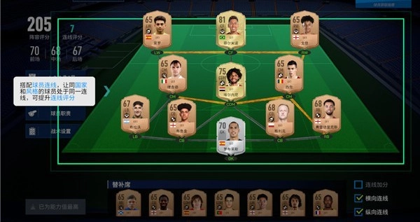 3、玩家可通过搭配球员连线,使同国家或同风格的球员处于同一连线中,以此提升连线评分。
