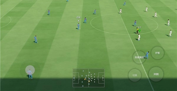 7、顺利进入游戏后,玩家需借助左侧操控角色方向,右侧则负责铲断、切换、冲刺、加速施压等技能的操作,以此开启属于自己的比赛征程。