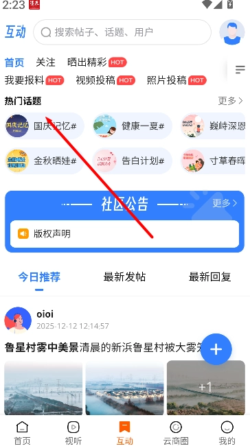 2、进入互动界面后,浏览热门话题板块,以掌握当下受关注程度较高的讨论内容。