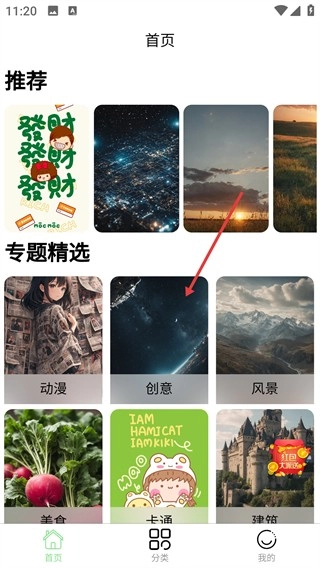 1、在首页的【专题精选】板块,挑选目标分类(例如【创意】),点击对应的分类卡片,就能进入该分类的内容列表页面。