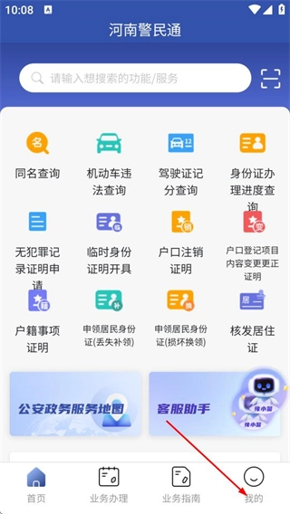1、打开河南警民通首页后,点击底部的“我的”选项,即可进入个人页面。