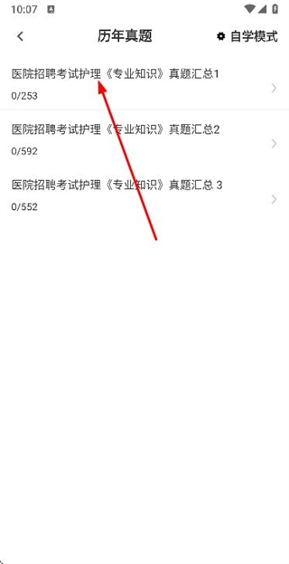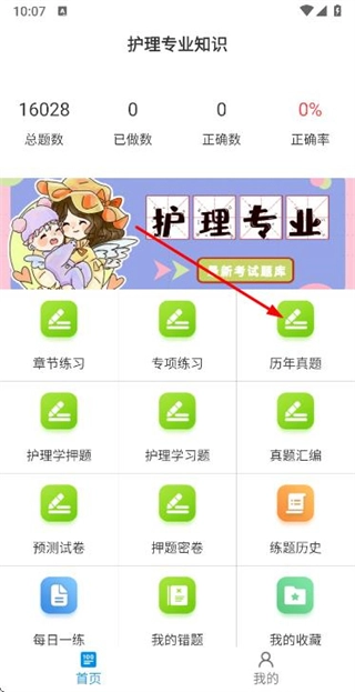1、在护理专业知识首页点击历年真题选项,进入历年真题页面。