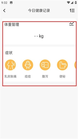 2、进入今日健康记录页面,可填写【体重管理】数据,还能选择【乳房胀痛】等经期相关症状进行记录。