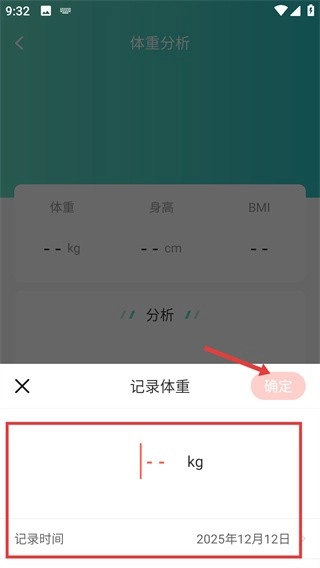 4、在记录体重弹窗中,填写体重数值并确认记录时间后,点击【确定】按钮完成体重记录操作。