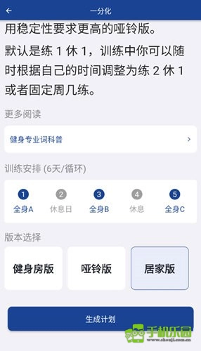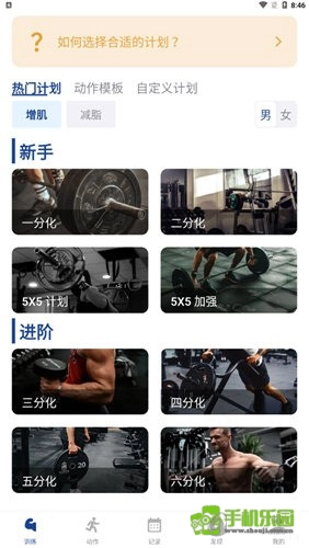 在首页,你能看到各式各样的健身计划。点击你感兴趣的那一个,了解该计划的详细介绍,再结合自身实际情况(比如健身所处的环境、拥有的设备条件等),挑选出最适合自己的版本——健身房版、哑铃版或者居家版都可以。