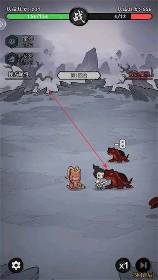 3、关卡战斗界面,显示第1回合及双方队伍战力,角色会自动攻击敌方单位,削减其血量以推进战斗进程。
