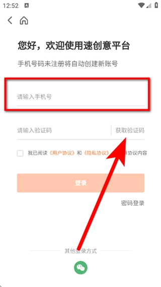 3、在速创意平台登录页面,输入手机号,点击获取验证码。