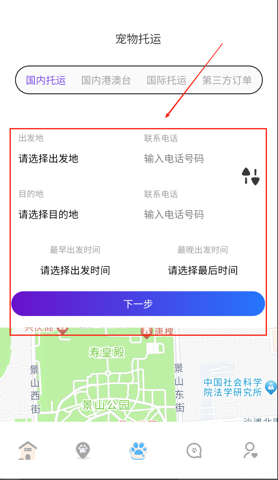 1、打开选择出发地和目的地,填写宠物信息即可生成电子托运单。