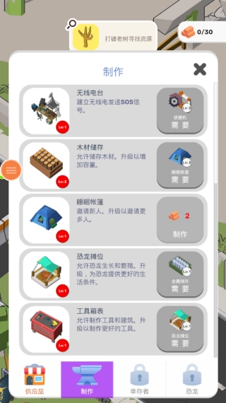 3. 如下图所示,在制作面板里,玩家能够查看所有可建造的设施种类,通过收集更多资源,来建造并升级幸存者基地!