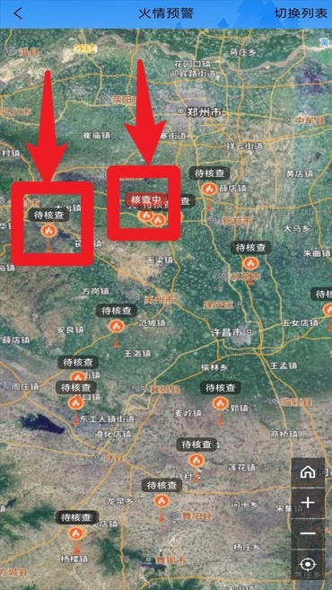 2、在火情预警页面中,可查看地图上标注的火情位置及待核查状态,支持切换列表视图。