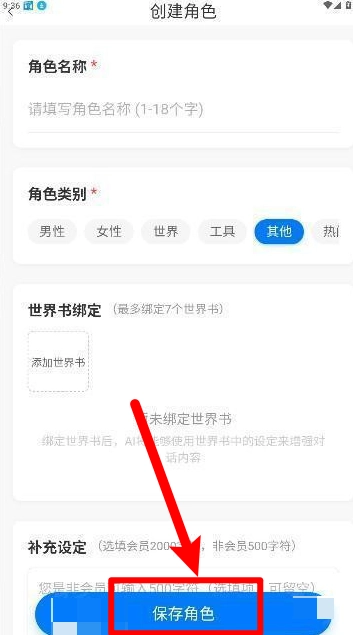 5、最后填写据说名称、选择选择,补充相关信息后,点击底部"保存角色"即可。