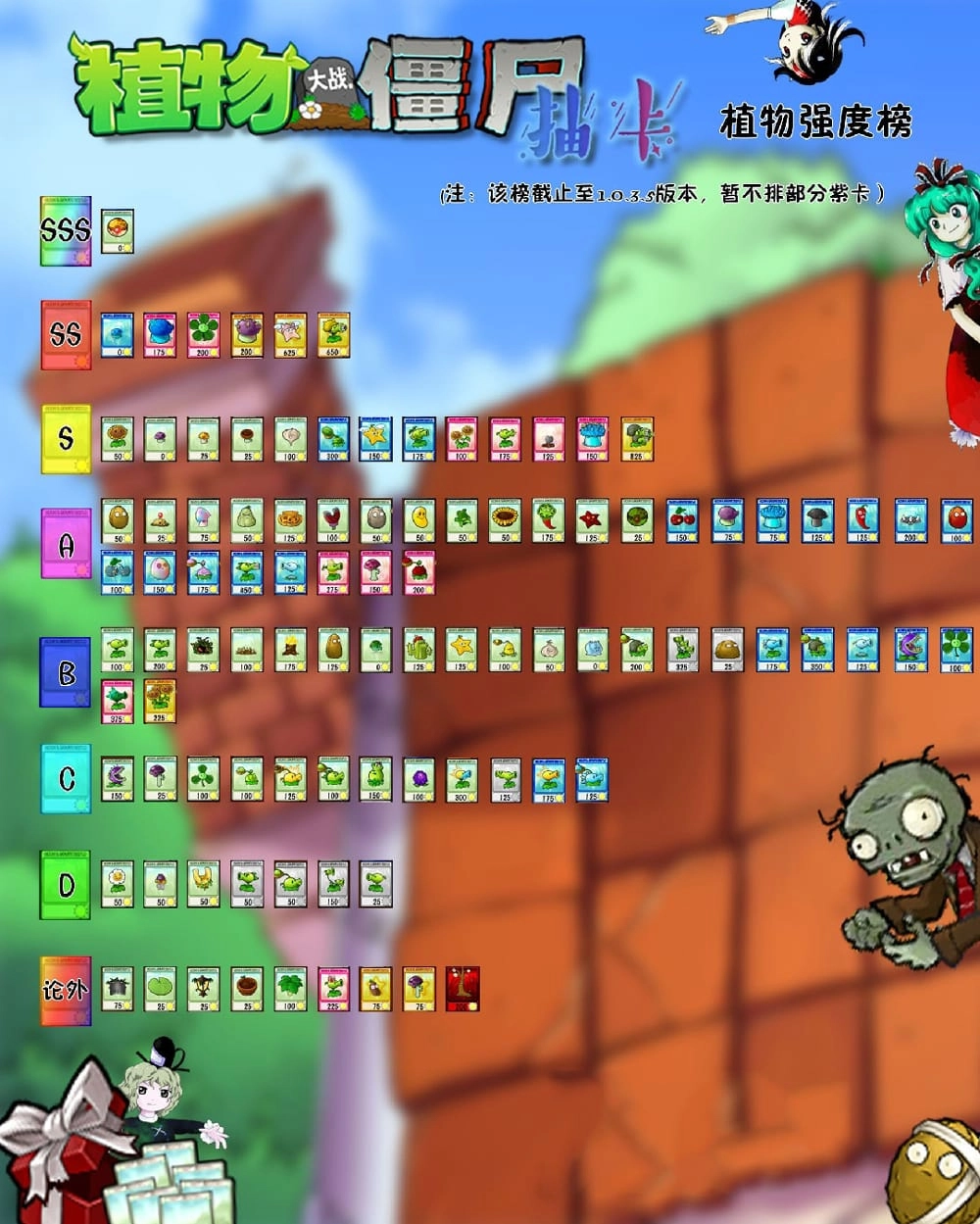 蓝色稀有卡(25%概率抽取):樱桃炸弹、寒冰射手、大喷菇、寒冰菇、毁灭菇、火爆辣椒、西瓜投手、地刺王、火焰射手、爆炸坚果、寒冰樱桃炸弹、魅惑坚果、寒冰小喷菇、机枪卷心菜、全息豌豆射手、天使星星果、毒大蒜射手、原始豌豆射手、寒冰豌豆投手、散射双发射手、反向全息豌豆射手