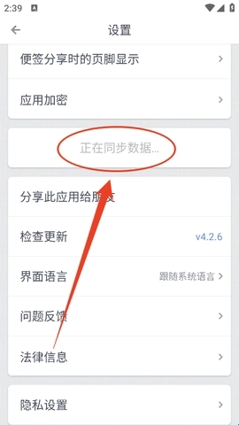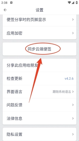 3、登录成功之后,下滑设置页,找到“同步云端便签”,点击一下。