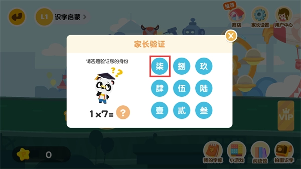 2、操作完成后会弹出【家长验证】的弹窗,其中的题目是1×7=?,只要选择对应的【柒】选项,就能完成这次身份验证步骤。