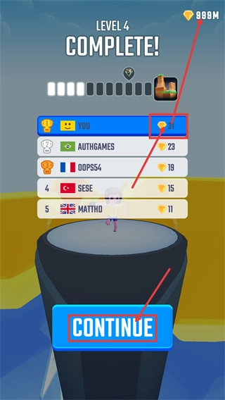 4、完成【LEVEL-4】后,点击【CONTINUE】进入下一关,同时可积累获得的【999M-钻石】奖励。