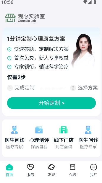 1、启动《观心实验室》应用,在首页的导航栏里找到并进入服务板块,浏览查看里面包含的各类心理训练项目以及放松练习相关选项。