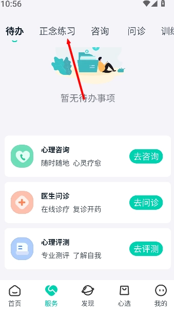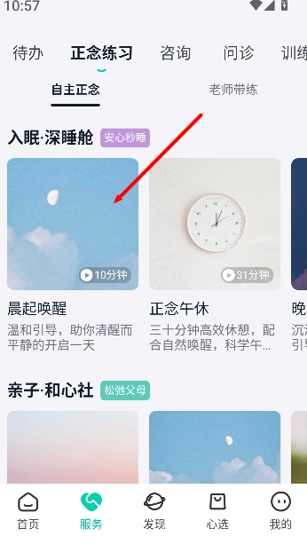 2、在服务板块里点击正念练习,进入正念训练界面,查看练习步骤和时间安排。