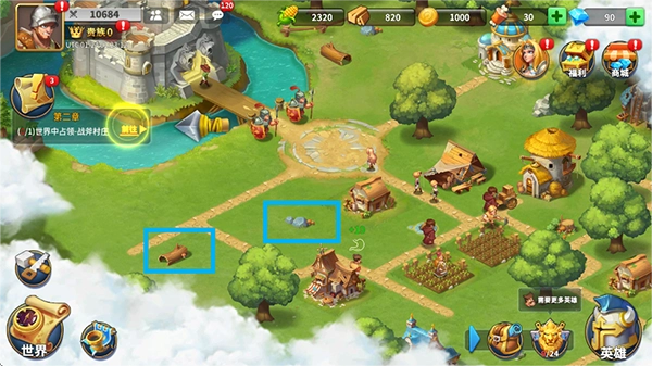 领地内的荒木、石头、宝箱等物品支持点击互动;随着领地范围的扩大,还会解锁新的互动物品。完成第二章任务后,记得把当前领地内所有这类可互动物品都点击一遍,这样就能获取金币和木材了。