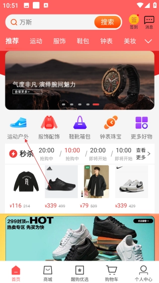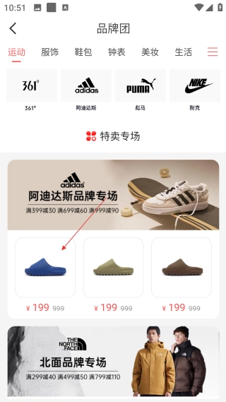 1、在首页,点击顶部【运动】分类标签,进入对应的品牌团商品页面。